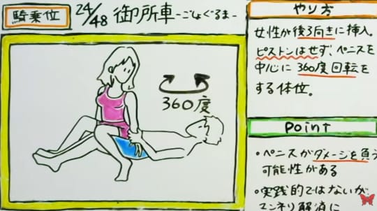 何のためにあるのか疑問に感じるのが御所車です。仰向けの男性の上にしゃがんでまたがり挿入し、女性が360度ぐるぐる回るという体位。