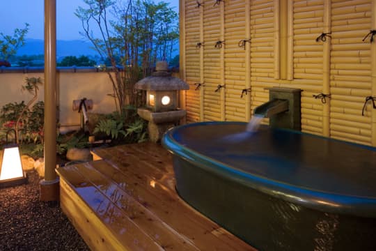 ディナーの後は、天然温泉でゆっくりと旅の疲れを癒します。より、プライベート空間でのバスタイムを楽しみたい方は、嵐山天然温泉の貸切風呂を楽しめる"月読ノ湯"や、露天風呂付きの客室も有りますよー