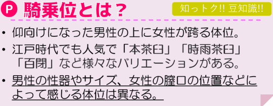騎乗位といっても、女性が上位になって挿入する通常の騎乗位とは違い、寝ている女性のおっぱいの上に股がり、男性が腰を振るパイズリのことです。