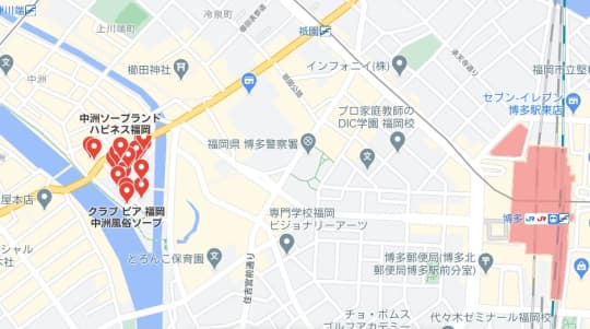博多のソープ・エリアは「中洲」というエリアで、JR博多駅からは15分程度、地下鉄空港線の祇園駅、もしくは中洲川端駅で、徒歩8分ほどです。