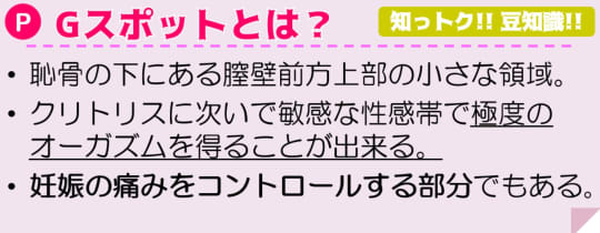 Gスポットは膣道、尿道、恥骨などに囲まれた場所にあり、性感帯のエリアと言えばおわかりいただけるでしょう。