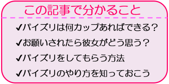 パイズリされるのって男性にとって夢のような時間。でもパイズリしてほしいって彼女にお願いしてもいいのかな?と悩んでいる人も多いと思います。彼女にパイズリしてもらうにはどのようにお願いをしたらいいのか、どうしたら快くOKしてもらえるのか女性目線で解説します。