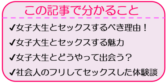 ということで今回は私の実体験を交えつつ、社会人が女子大生とセックスする方法や、そのときの注意点を徹底的に解説していきますので、ぜひ参考にしてください!