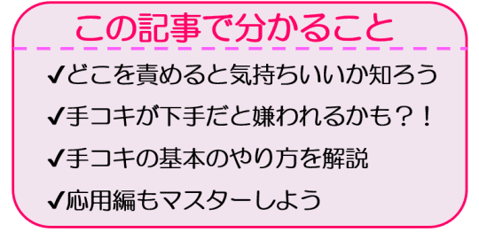 手コキのやり方がよくわからない…そんな手コキ初心者の女性のために、手コキされ続けてきた私が手コキの基本中の基本をご紹介します。これさえ読んでおけば、手コキで失敗することはありません。手コキのやり方をマスターして男性を気持ちよくさせましょう。