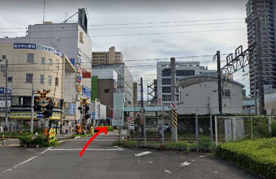 この踏切を渡って直進します。