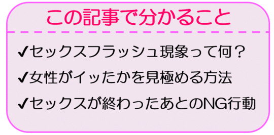 今回は、セックスフラッシュ現象に関して解説した上で、女性がイッたかどうかを確認するための見極めポイントを紹介していきます。