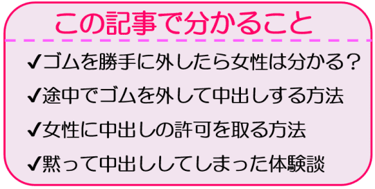 ただし、そのためにはすばやくゴムを外すことや、女性を気持ちよくさせておくなどのコツがあります。ゴムを外すテクニックはこのあと詳しく解説していきます。