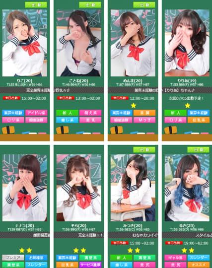 激安の上、豊富なオプションも全て無料なのに、女の子のレベルを落とさない評判の「バカンス学園 谷9校」、気になる女の子の質ですよね。男心をくすぐる黒髪の優等生系から、小悪魔的なギャル系まで、様々なタイプが在籍している事でも有名で、常識破りのサービスも含め、多くのロリファンから強い支持を得ています。