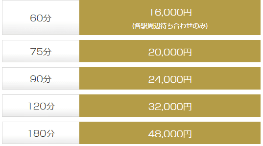 次に75分コースで20,000円、90分コースで24,000円、120分コースで32,000円、最長180分コースで48,000円となっています。