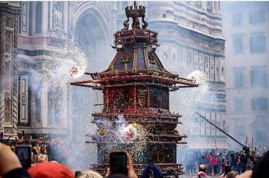 フィレンツェで毎年行われる、復活祭の伝統行事、スコッピオ・デル・カッロ(Scoppio del Carro)は見物です。10時にパレードが始まり山車が運ばれ、11時に大聖堂前で山車の花火が点灯されます。無事に花火が打ち上げられれば、フィレンツェの一年は豊作で、幸運に恵まれるという願掛けでもあります。当日は早めに場所取りに行きましょう。