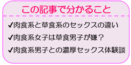 合わせて肉食系と草食系のセックスの違いもご紹介するので、ぜひ両者のセックスを知り、肉食が合いそうか、草食が合いそうか…ぜひ自分好みのセックスを見極める参考にしてくださいね!