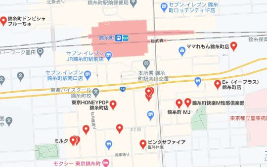 錦糸町の風俗店は、みごとに駅の南側に点在しています。