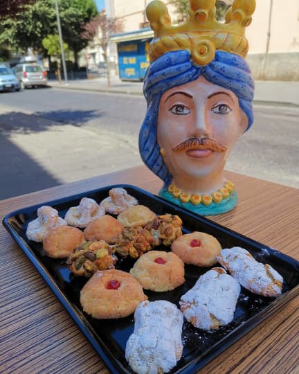 上の写真は南イタリアの太陽をたっぷり浴びた育った特産品、アーモンドやピスタチオを使ったお菓子です。シチリアはマヨルカ焼の陶器も有名です。