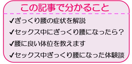 セックス中にぎっくり腰になってしまった経験はありませんか?激しいセックスをしていると腰に負担をかけてしまうことがあります。でも痛みがあっても性欲は抑えられません……ぎっくり腰でもヤリたいのが人間の悲しいサガです。腰にやさしいセックスとぎっくり腰の対処法についてご紹介します!
