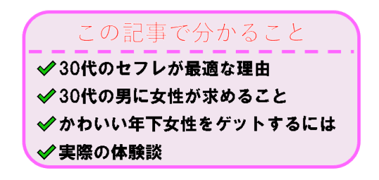 今回私がオススメするのは30代男性のセフレ!