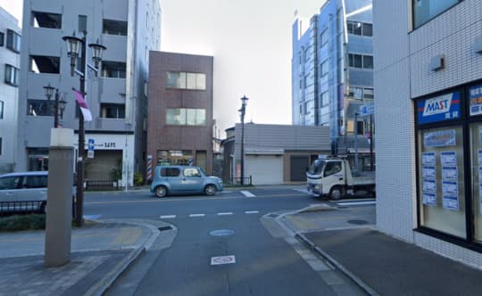 突き当りを右に曲がってください。目の前の床屋が目印です。