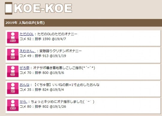 2019年KOE-KOE人気ランキング上位オナニーボイス