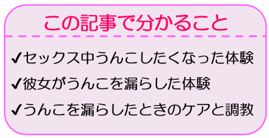 人間には逆らえない生理現象があります。うんこです。突然やってきては絶対に出ようとします。それは日常生活はもちろん、セックス中にも起こるもの。今回は彼女とうんこにまつわるエピソードを紹介。セックス中にしたくなった話、彼女がうんこを漏らした話をお楽しみください。