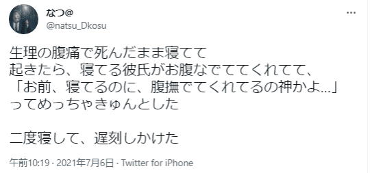 普段歩くのが早い彼氏が生理の時は、私のペースに合わせてゆっくり歩いてくれたり、「御手洗大丈夫?」と、言ってくれたり、寒い日に暖かい飲み物を買ってくれるのは嬉しい♪︎