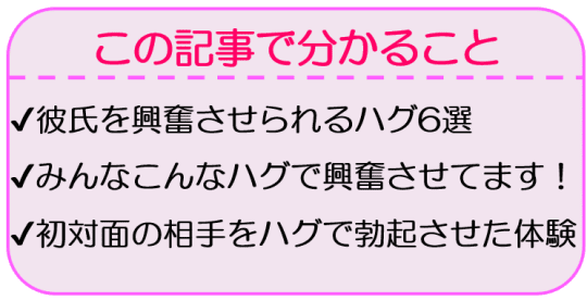 彼氏をすぐに勃起させちゃうのは実は簡単!ハグだけで男性を勃起させる方法を徹底公開しちゃいます!300人以上をガチガチにボッキさせてきたヤリマンのテクニックをものにしませんか?彼氏を興奮させてさらに仲良くなっちゃいましょう!