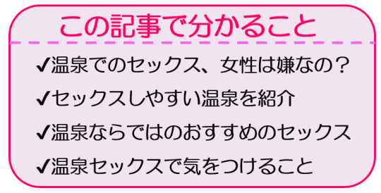 温泉でセックスを満喫するために、しっかりと事前に準備万端にしておきましょうね!