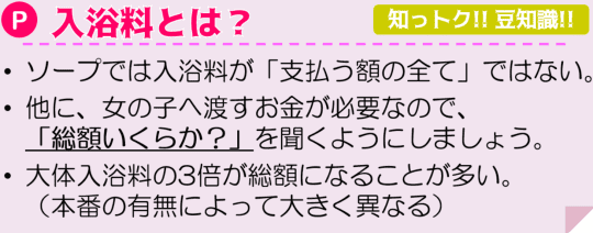 一般的に、サービス料は入浴料の2倍になっており、例えば入浴料が2万円の場合はサービス料が4万円で計6万円かかるというわけです。