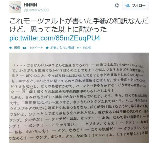 wikipedia.org/wiki/ヴォルフガング・アマデウス・モーツァルトモーツァルトの童貞喪失の相手、従妹のベーズレは、長年にわたってモーツァルトと「うんこ文通」を続けていた相手のひとりです。