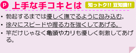 陰茎(竿)を横からパクッと咥えると上目遣いになりやすく、男受けばっちりです。やや長めにストロークすると早漏予防にもなります。