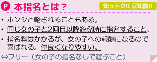 本指名だと、女の子へのバックの割合が増えたりするお店もあります。得をさせてあげたいなぁ…と思ったら、女の子にちょっと聞いてみましょう。