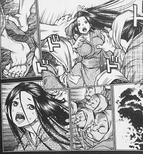 着物をはぎとられ、アソコをいじられてもなお眉ひとつ動かさず、じっと男たちを見据える表情には凄みを感じました。