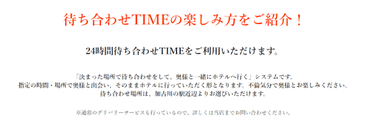 「ドMな奥様 加古川店」の醍醐味はもう1つあり、予約後に女の子から電話が入り、決めた場所で待ち合わせ、そこから一緒にホテルへ行くシステムとなっています。その時、オプションにある「待ち合わせ飛びっ子」を利用することで、ホテルに着くまでの間、楽しむ事ができます(興奮)。