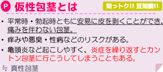 そもそも皮をむくことができない真性包茎の場合は、衛生的にも性生活的にも支障があるので、手術などでしっかりと治療することをおすすめします。