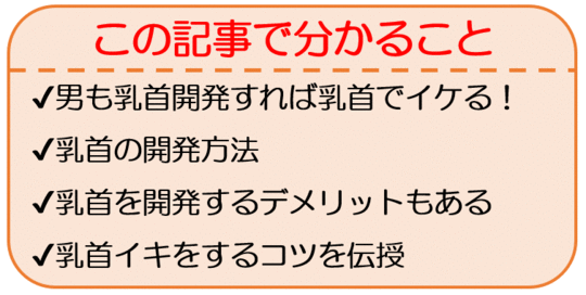 乳首で感じるのは女性だけではありません。男性にとっても数少ない性感帯の一つで、開発次第で乳首イキも出来るほど敏感な場所なんです。これさえ覚えてしまえばオナニーもセックスも今の何倍も気持ちよくなれること間違いなし!!順を追いながら詳しく解説していきましょう!!