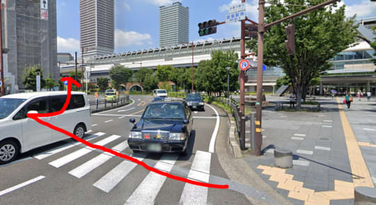 JR岐阜駅の中央南口を出ます。横断歩道を渡って、赤い矢印の方に直進してください。