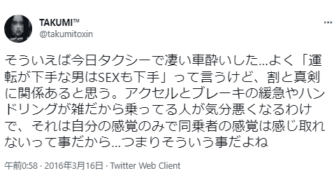 夜遊び太郎は昔「あの運転手!運転もセックスも下手だろうな!」なんて1人でよく呟いていたんです。笑