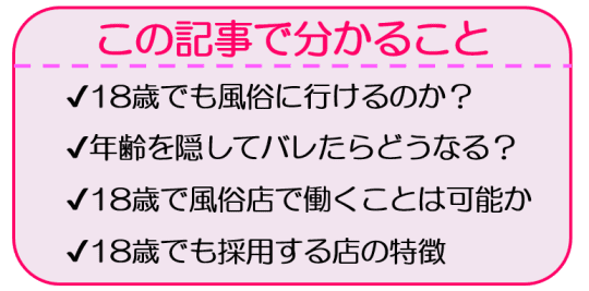 - Q風俗は18歳でも遊びに行ける?A遊びに行く側も18歳で風俗に行けます。ただ、こちらも高校生の場合は入店拒否をされることも・・。要は大学生、社会人ならOKの認識でいいでしょう。