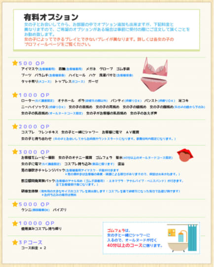 有料オプションは、「アイマスク・首輪など多数500円」「ローター・オナホールなど多数1,000円」「コスプレ・AV鑑賞など多数2,000円」「ゴムフェラ・聖水など多数3,000円」「クンニ・パイズリ5,000円」「使用済みコスプレお持ち帰り10,000円」など、数々のオプション設定がありますので、無料オプション共に詳しくは公式HPをご確認ください(無料オプションも多すぎます)。
