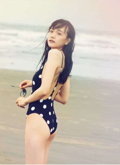 背景のぼやけた海の青との「コントラスト」からか、それとも一体感からか、「松井愛莉」の「肌」の質感に、「透明感」さえ感じてしまいますね。