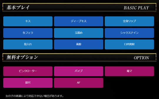 基本プレイは「キス」「ディープキス」「全身リップ」「生フェラ」「玉舐め」「シックスナイン」「指入れ」「素股」「口内発射」で、付帯する無料オプションは「ピンクローター」「バイブ」「電マ」「即尺」「AF」となっています。