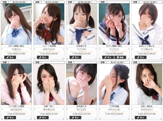 又、オプションは「無料:コスプレ・ペンライト・はけ・コスチューム・つり革・アイマスク・手枷・パンスト・パンティー・ルーズソックス・ハイソックス・上履き・ローファー・めがね・聴診器」、「1,000円:ガーターベルト・ローター・網タイツ・コスプレ持込・写メ1枚で顔NG」、「2,000円:オナニー鑑賞・ミニバイブ」「3,000円:電マ・放尿」、「4,000円:写メ放題で顔NG」、「5,000円:顔射・ごっくん」「10,000円:動画撮影で顔NG」となっています。