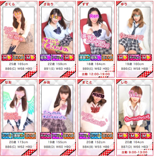 ベイビーガールではこのように10代〜20代の若い制服を着た嬢たちが接客をしてくれます。素人感のある嬢ばっかりですので、男性の好みに染め上げることができますよ!