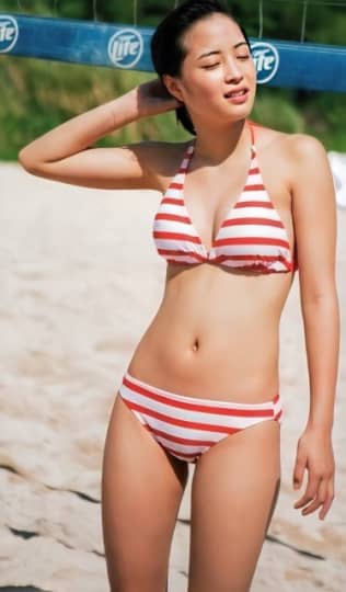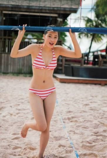 白の下地を基調としたものに、赤い線が入った「ボーダー」の水着はなかなかの派手さだと思うのですが、それをナチュラルに着こなしてしまうのは、さすが「広瀬すず」だというところではないでしょうか。