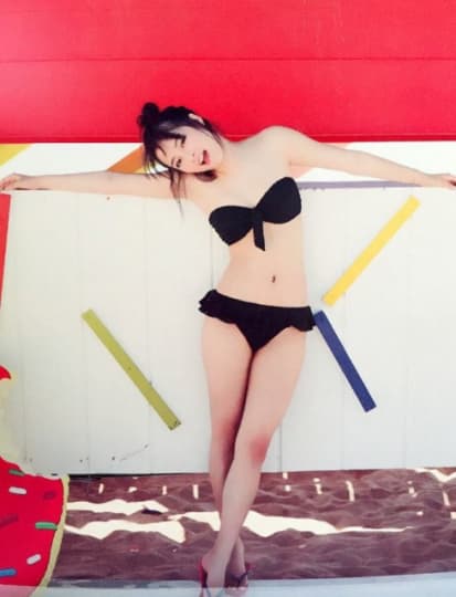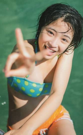 「黒い水着姿」で両手を全力で広げて、顔をかなり横にかしげ、脚先をクロスさせている全身から、私には「若さ」という勢いを感じさせてくれる「広瀬すず」の画像なのです!