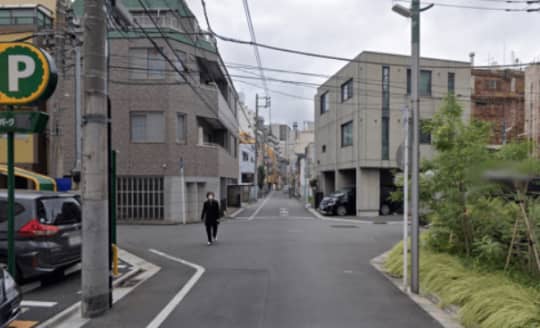 こちら左側に「コインパーキング」がある十字路を、画像右に曲がってください。