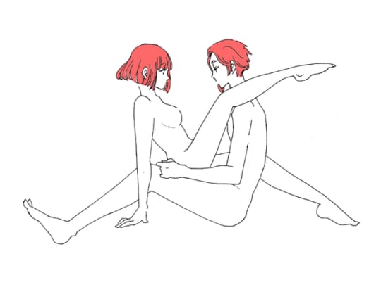 【帆かけ茶臼】は、脚を伸ばして座った男性の膝の上に、女性が向かい合わせで脚を開いて座り、片方の脚を男性の肩に乗せピストンする体位です。