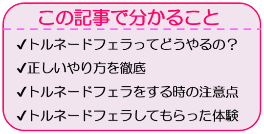 トルネードフェラって一体どうやるんだろう?何て疑問に思った事ありませんか?トルネードフェラを身につけたいけど、トルネードフェラの情報ってあんまり世に流れていないモノ。当記事ではトルネードフェラのやり方について、解説をしていきたいと思います。