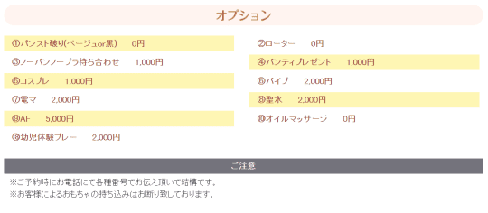 オプションは「無料:パンスト破り(ベージュor黒)・ローター・オイルマッサージ」「1,000円:ノーパンノーブラ待ち合わせ・パンティプレゼント・コスプレ」「2,000円:バイブ・電マ・聖水・幼児体験プレイ」「5,000円:AF」となり、こちらの看板コースである幼児体験プレイが2,000円、AFが5,000円と、フルプレイに欠かせないオプションが低料金設定なのが嬉しいですね。