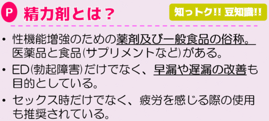 ただし、精力剤は毎日しっかりと長期に渡って服用することで効果が得られるもの。即効性を感じる人もいれば、数ヵ月後に効果が実感できたという人も。
