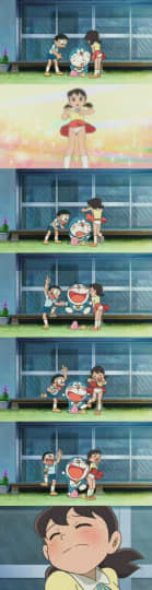 音声がなくともドラえもんとのび太がくんがど牛て喜んでいるのかが想像つきます。笑