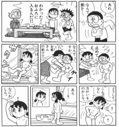 お風呂に入るにはもちろん服を脱ぐ必要があるので、自然とのび太くんも女性二人の前に裸になってしまうことに。笑